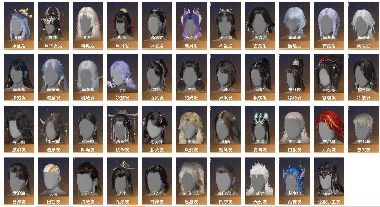 开辟鸿蒙·日月明,龙之影·过江龙,龙之影·生死局,龙之影·精武魂,怦然心动·热力节拍,绝代风华,毕方,熛怒炼火,初代玄女,化生明王,狂龙,狼主,泣珠龙纱,戎金狼,西行劫·如意金箍棒,香雪水兰,夜魅游莹,飞将戟,惊百里,帝星,星辉魔纱,西行劫·悟空,西行劫·紫衣仙子,耀世魂花,主祭者,八宝龙王,碧水青天,苍狼之主,苍雷丸,赤丹朱湛,赤雾烟霞,贵胄少女,寒英素雪,瀚海苍鹰,弘毅袍,辉光,金襦玉衫,金羽客,惊云羽,净金宝相,狂猎,梨园传奇·法海,麟鹿大铠,灵鹿巫者,逆水寒·江海沧澜,清雅少女,瑞火麟,若谷,若水尊者,蜃楼魅影,守誓者,探海裙,骁骑,行空裘,絮云衣,雪山天女,阴阳姬,游四海,追猎,紫金玉女,醉山川,九骊之君,紫微星命,观山海·文鳐,长歌诗韵·戍关将,观山海·獬豸,百战·破荆者,决战平安京·热海白珊,御宅花织,阴阳师·灼舞桃节,决战平安京·御神之刃,逆水寒·极夜天曦,花无痕,觉之一念,司天命,观山海·秋神蓐收,巨鲸客,绮云衫,观山海·青鸟,观山海·冬神玄冥,夏日派对·椰风夕照,沐昭,天钿女命,斗罗大陆·唐三,逆水寒·江海羲炎,幽篁山鬼,梨园传奇·素贞,百战·断链,魔杰·傲昆仑,玄绶罗衣,掌珠仙子,西行劫·蜘蛛精,霜天红叶,姑射真人,墨离,暖冬茶馨,神机袍·缤纷